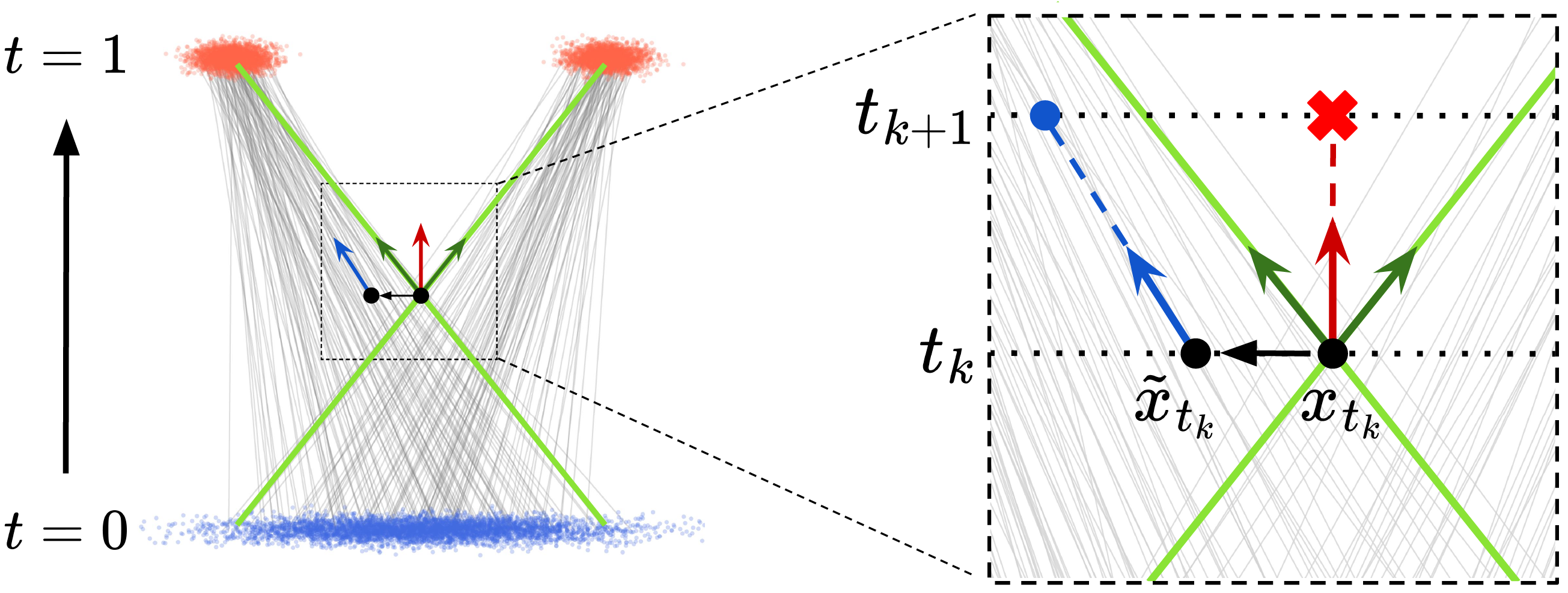 An overview of FDS. Our framework refines intermediate states to avoid high-discrepancy regions. In standard settings, severely conflicting sample-wise velocities can drive the marginal velocity toward low-density regions, leading to degraded samples (red cross). To counteract this, our framework effectively steers the trajectory toward a reliable, low-discrepancy region (blue circle).