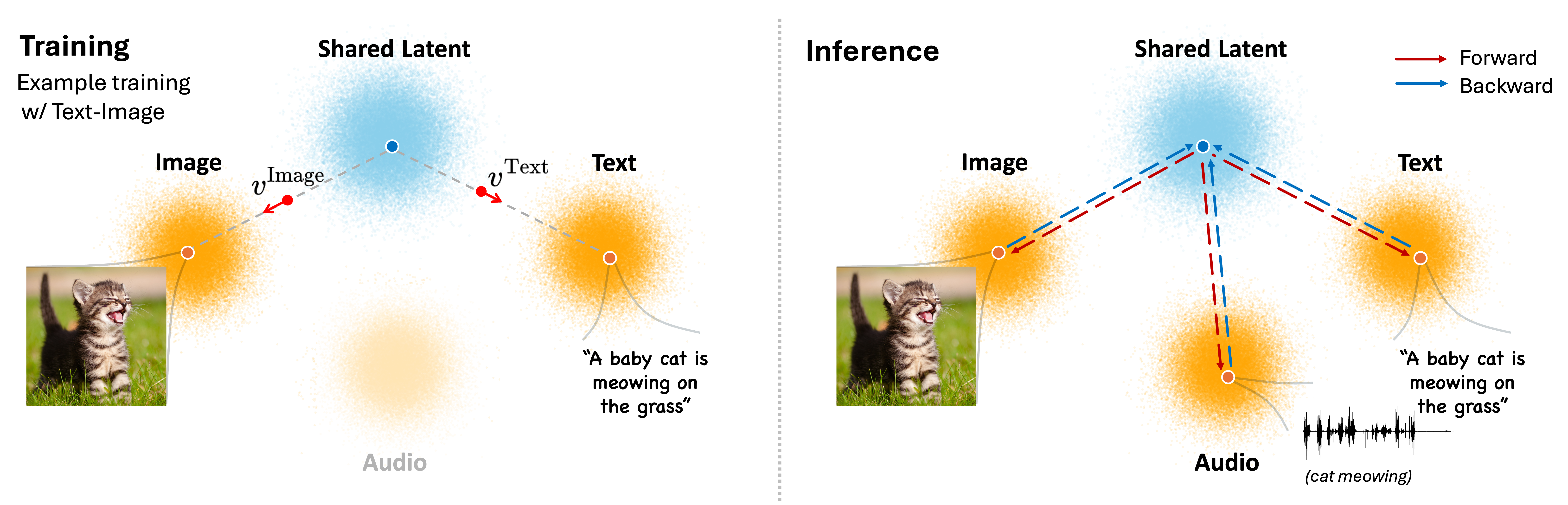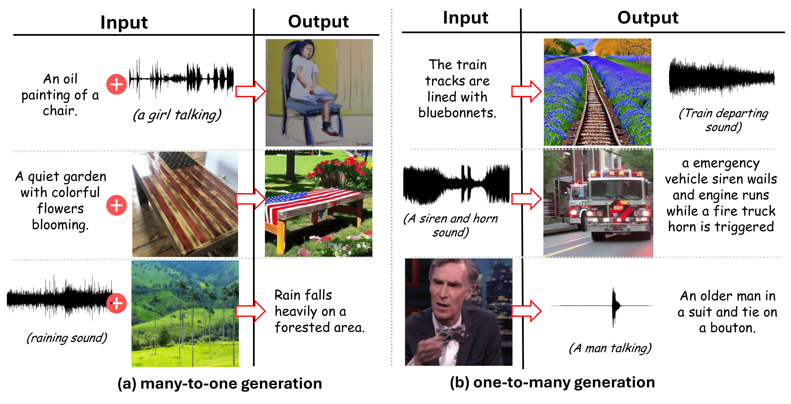FlowBind can take multiple inputs and generate outputs that are aligned with all provided modalities.