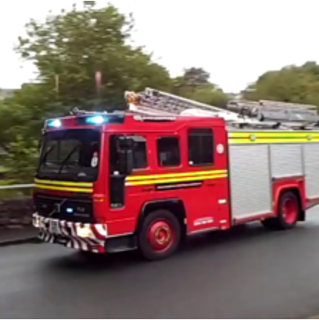 "an engine idling with bells ringing in the background" |