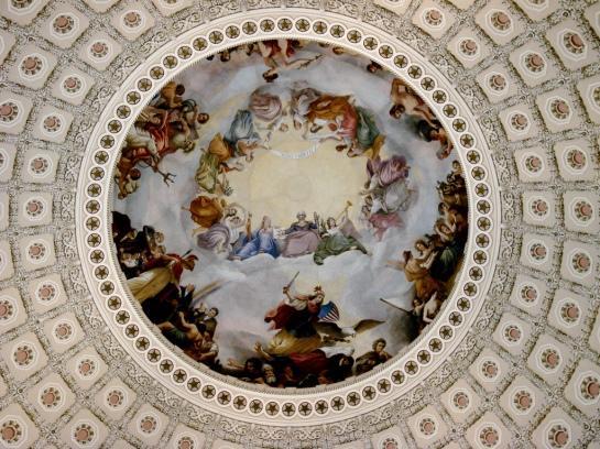 The ceiling is painted with paintings on it. |