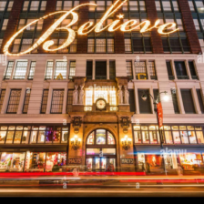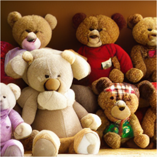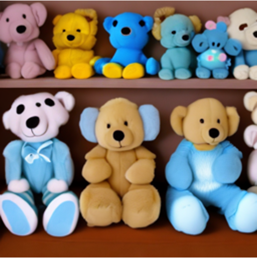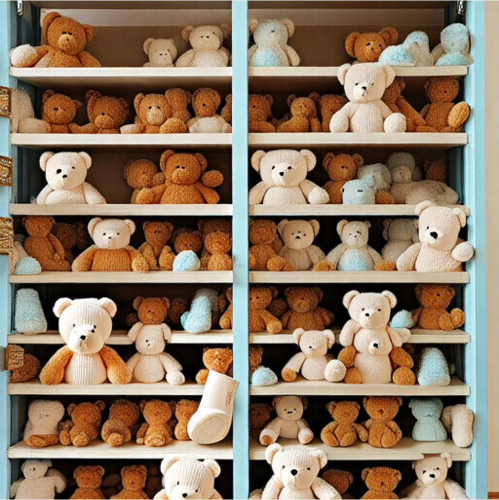 "There are many teddy bears sitting on the shelves." |