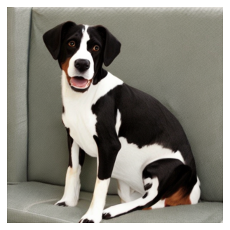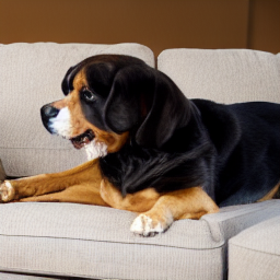 "A dog is sitting on a couch and barking." |