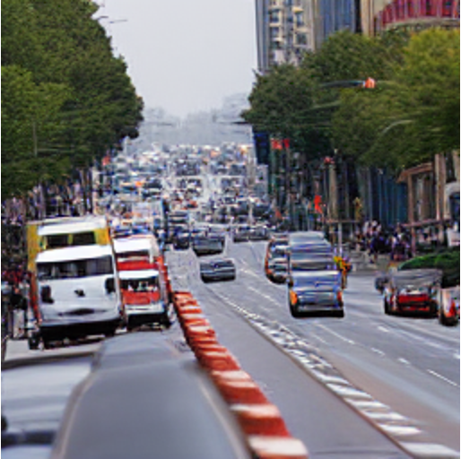 "A busy street with several cars and buses driving on it." |