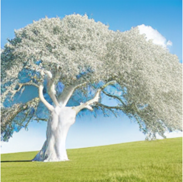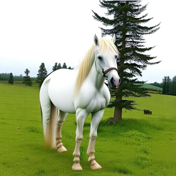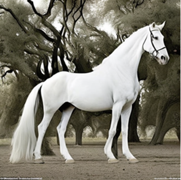 "A white horse standing next to a tree." |