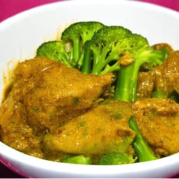 "Meat and broccoli in sauce are in a bowl." |